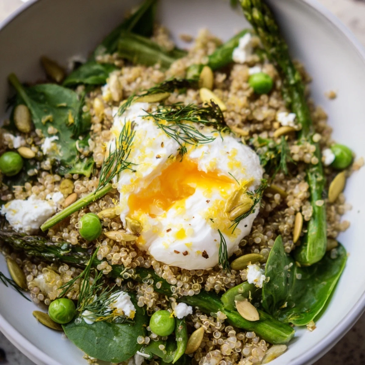 Fresh asparagus and sweet peas bring essential vitamins and a satisfying crunch, naturally complementing the nutty quinoa. A runny egg creates a rich, creamy element when broken into the grains, while the zesty lemon dressing brightens every bite with fresh citrus notes.