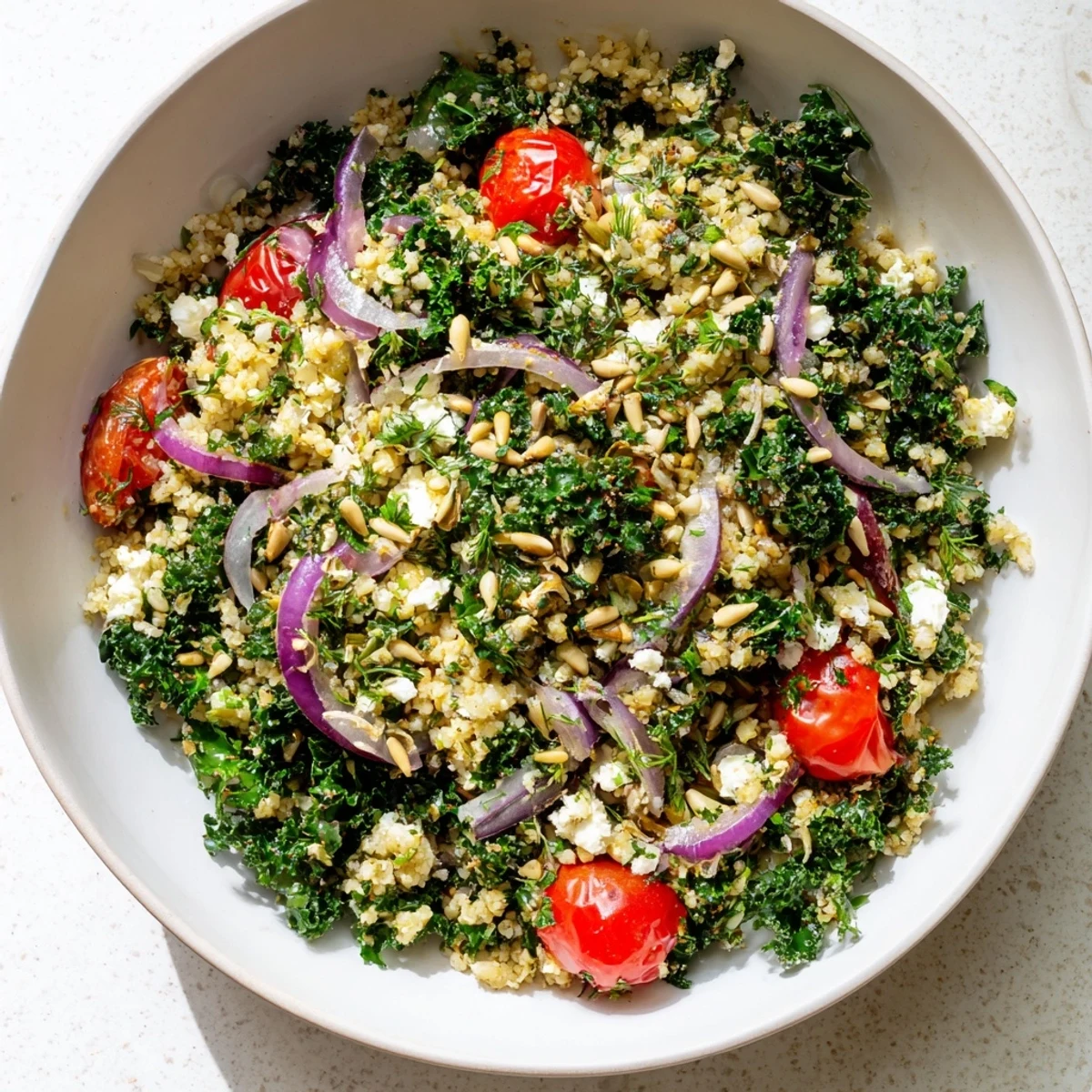 In summer, I swap kale for fresh spinach and add cucumber instead of tomatoes. Winter calls for roasted squash or sweet potatoes mixed right into the grains.