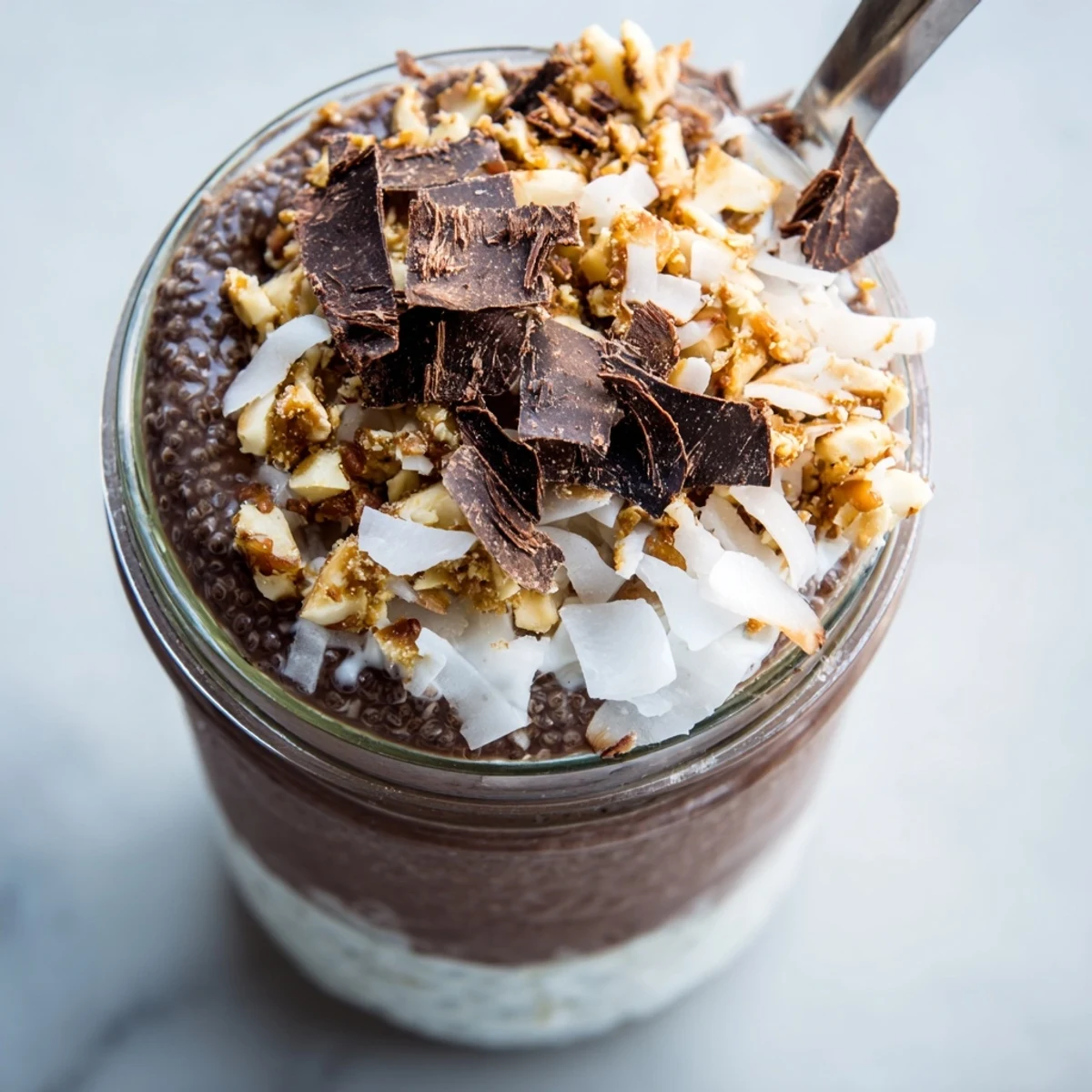 This stunning layered parfait brings together the rich, earthy notes of cocoa-infused chia pudding with the tropical sweetness of coconut yogurt and the satisfying crunch of maple-toasted hazelnuts. The chocolate layer develops a velvety pudding texture as the chia seeds gel, creating a luxurious base that's naturally sweetened with maple syrup.