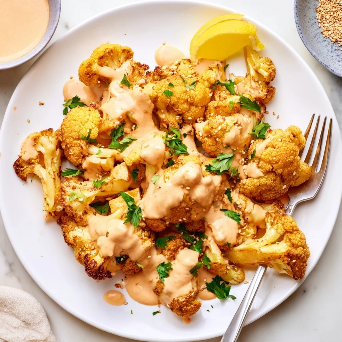 Golden roasted cauliflower florets get transformed with a luscious spicy tahini sauce, creating a simple yet impressive dish that brings Middle Eastern flavors to your table. The cauliflower becomes tender and lightly charred in the oven, while the tahini sauce adds rich creaminess with a kick of heat from sriracha and warm spices like smoked paprika and cumin.
