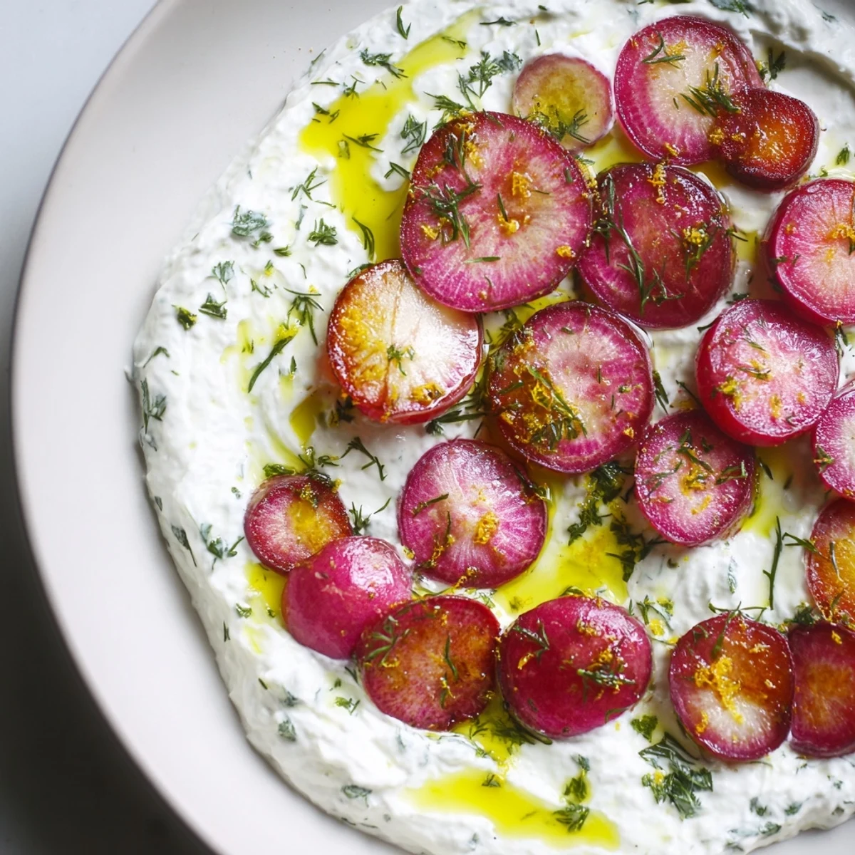 This versatile dish shines alongside grilled fish or roasted chicken, yet holds its own as a light appetizer with crusty bread. The preparation comes together quickly—toss radishes with oil and seasonings, roast at high heat, and whip up the seasoned yogurt while they cook. A finish of extra virgin olive oil and optional fresh herbs adds the perfect touch.