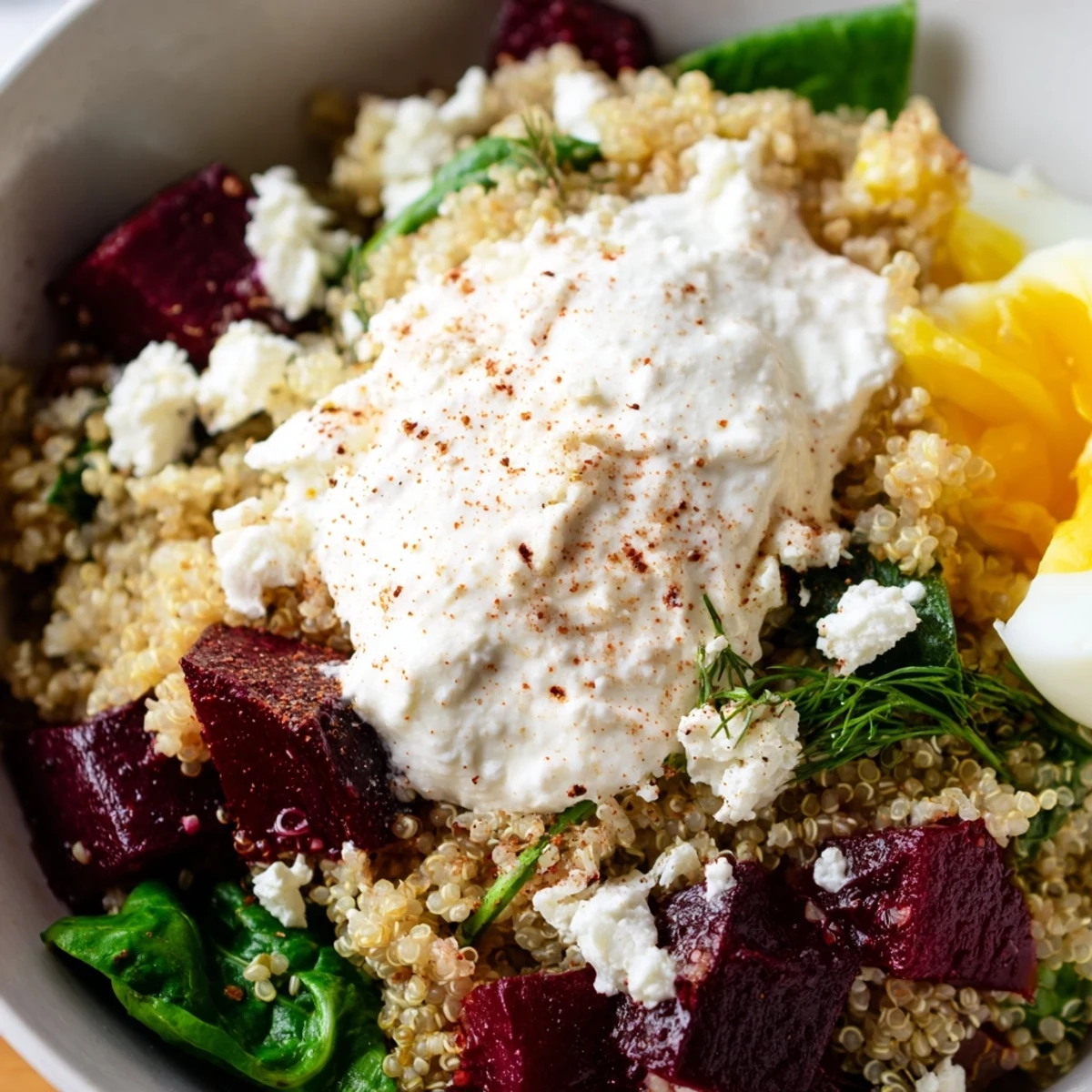 This nourishing breakfast bowl combines earthy roasted beets with fluffy quinoa, fresh dill, and creamy Greek yogurt for a vibrant morning meal. The beets develop natural sweetness during roasting, while smoked paprika adds subtle depth. Fresh spinach brings color and nutrients, perfectly balanced by tangy lemon juice and crumbled feta. Each spoonful offers contrasting textures—tender vegetables, light grains, and velvety dairy. Ready in just 40 minutes, this bowl suits meal prep and reheats beautifully for busy weekdays.