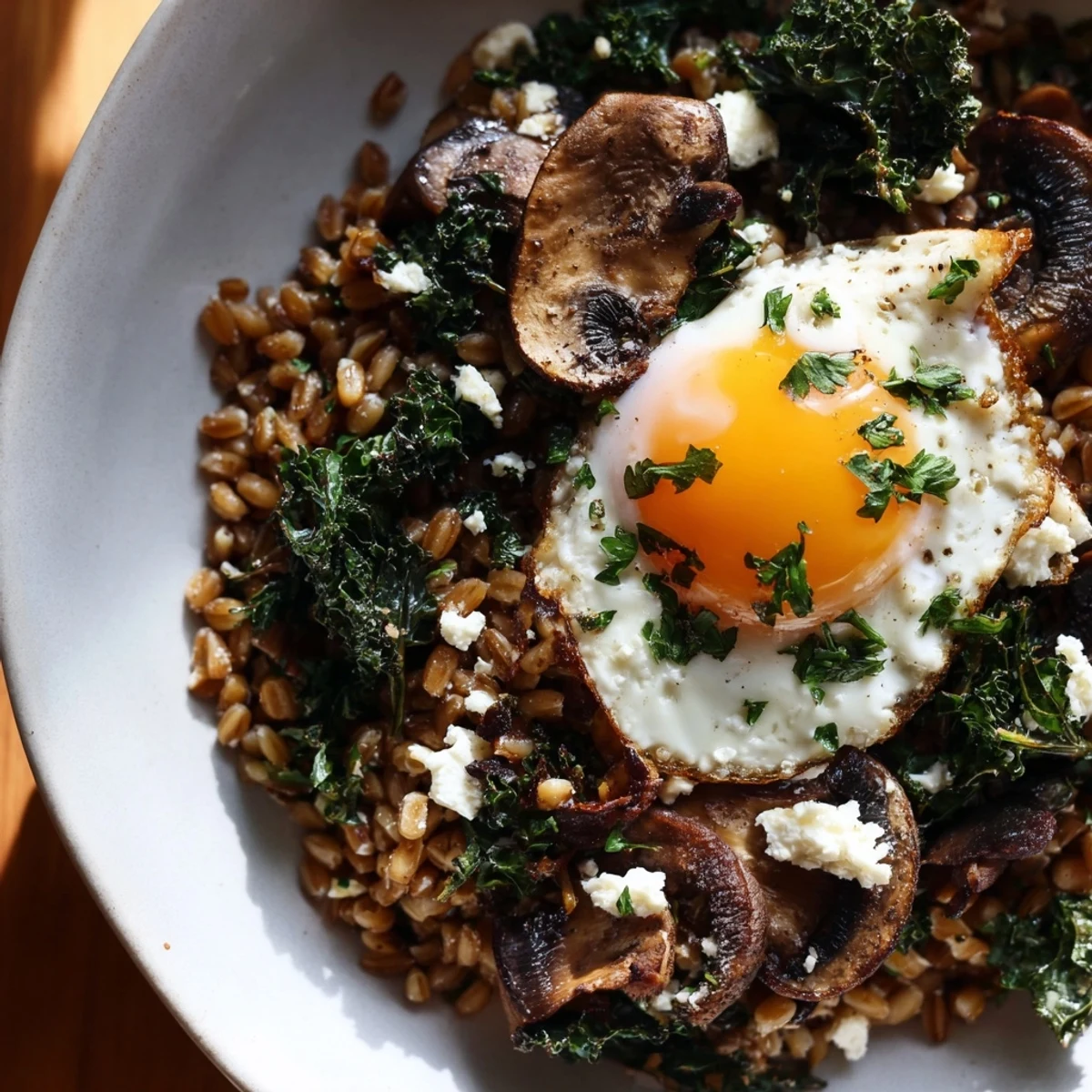 This savory breakfast bowl combines chewy, nutty farro with earthy sautéed mushrooms and tender wilted kale, all crowned with a perfectly cooked egg. The combination creates a wholesome, protein-rich morning meal that keeps you satisfied for hours.