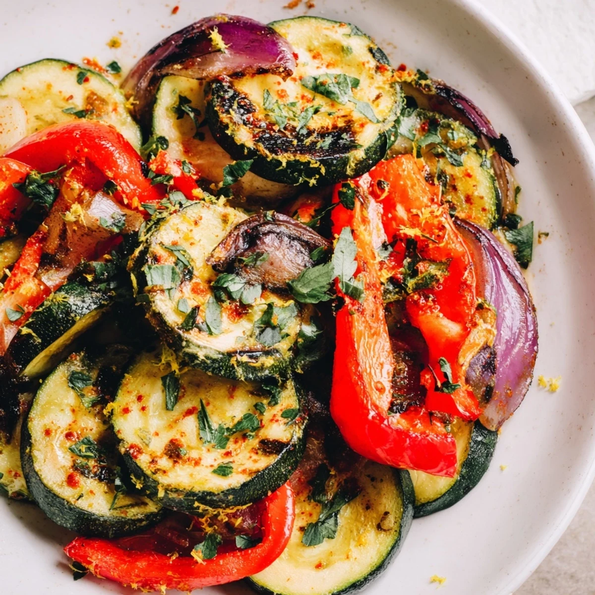 This Mediterranean-inspired dish combines tender zucchini rounds and colorful bell peppers, all roasted to caramelized perfection.