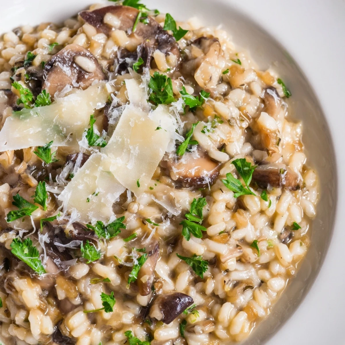 The barley should be tender with a slight chew, never mushy. The risotto should flow slightly on the plate rather than sitting stiffly. If barley appears hard after 40 minutes, continue adding warm broth gradually until tender.