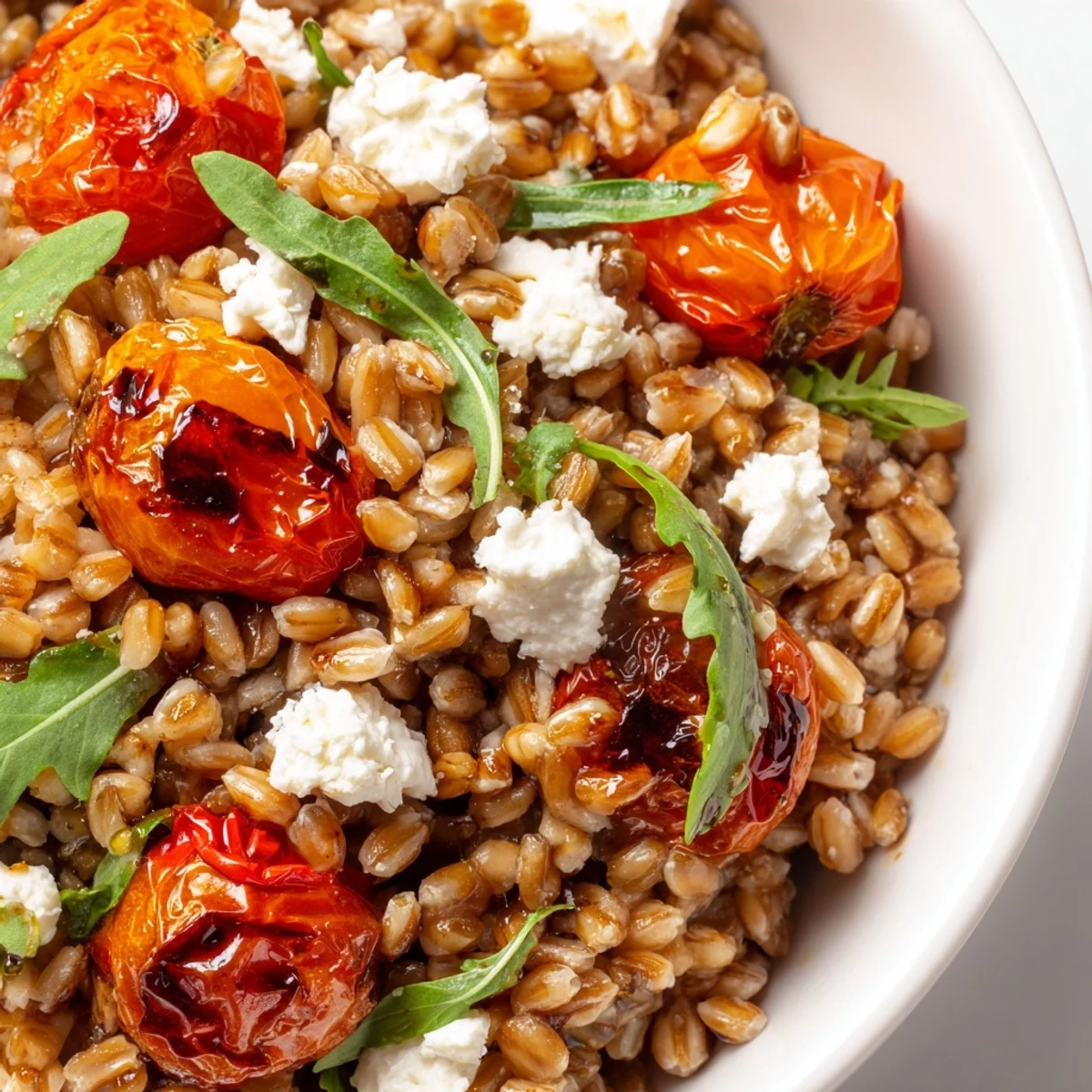 This warm grain bowl combines tender farro with naturally sweet roasted cherry tomatoes and red onion. The balsamic vinaigrette ties everything together, while peppery arugula adds fresh contrast. Perfect for meal prep, it serves well as a substantial side dish or light vegetarian main. The farro provides satisfying chew, roasted tomatoes bring depth, and fresh basil brightens each bite.